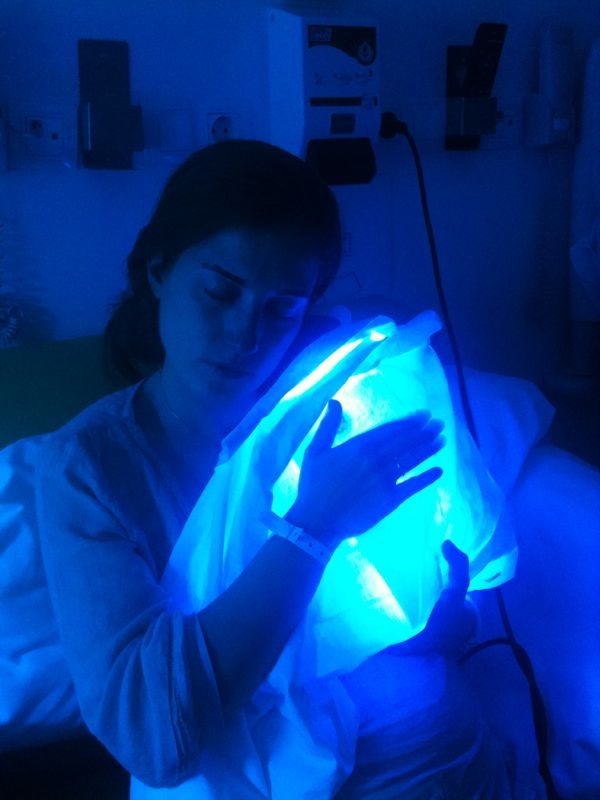 NOTA: Fotografía tomada con iPhone, de una de mis hijas durante su estancia en un hospital madrileño, tras el ingreso del primero de sus hijos para tratarlo de un exceso de bilirrubina.