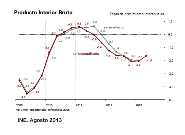 Revision PIB Anual agosto 2013Como puede apreciarse, en cuanto a la evolución del PIB a lo largo del presente año la variación anual, se ha mantenido en el primer trimestre (–2,0%), mientras que, curiosamente, ha resultado una décima menos negativa en el segundo, pasando del –1,7% al –1,6%.