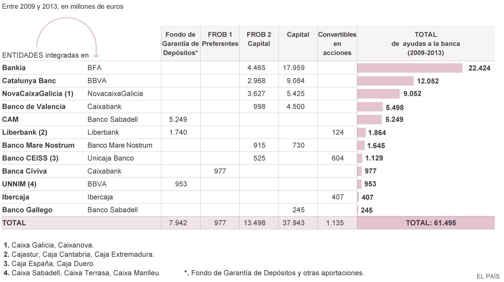 La mayor parte de los medios de información, con datos del Banco de España y del Frob, destacan que la reestructuración financiera ha sepultado ya 43.224 millones (entre inyecciones de capital, subvenciones a las EPAs, y ayudas a los compradores, o clausulas de salvaguarda de caída del valor de los activos, que es lo mismo).