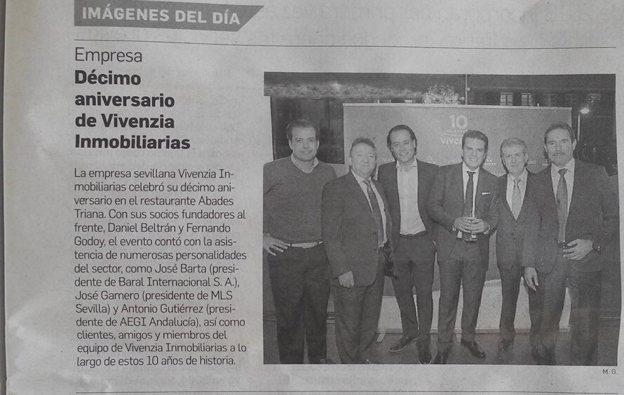 El pasado jueves, 16 de noviembre, fui invitado, por Daniel Beltran y Fernando Godoy, a la celebración del Décimo Aniversario de la constitución de Vivenzia Inmobiliarias, que en este corto periodo de tiempo se ha convertido en inmobiliaria de referencia en Andalucía, en particular en Sevilla.
