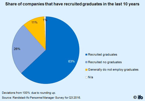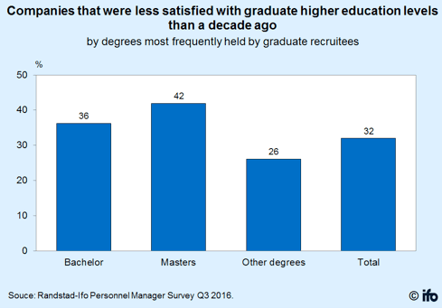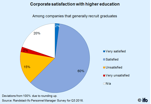 En la última encuesta realizada por el prestigioso Instituto alemán IFO, en colaboración con la empresa Randstad, sobre la satisfacción de las empresas alemanas respecto a la preparación de los licenciados y posgrados contratados durante los últimos 10 años, casi una de cada tres empresas manifestó que está menos satisfecha con los niveles de educación de los graduados que hace diez años.